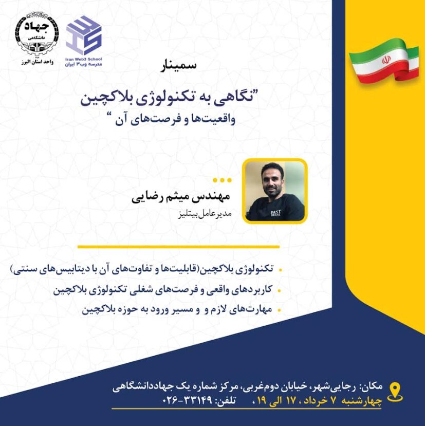 میثم رضایی، مدیرعامل شرکت بیتلیز و از فعالان برجسته در حوزه فناوری بلاکچین، به عنوان مدرس این دوره حضور خواهد داشت. وی در این سمینار دانش تخصصی و تجارب عملی خود را در زمینه کاربردهای واقعی بلاکچین، چالشها و فرصتهای پیش رو، و مسیر توسعه مهارتهای لازم به شرکتکنندگان منتقل خواهد کرد.
