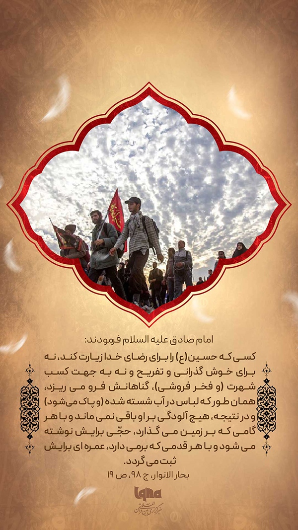 امام صادق (ع) فرمودند: کسی که حسین (ع) را برای رضای خدا زیارت کند، نه برای خوش گذرانی و تفریح و نه به جهت کسب شهرت (و فخر فروشی)، گناهانش فرو میریزد، همان طور که لباس در آب شسته شده (و پاک میشود) و در نتیجه، هیچ آلودگی بر او باقی نمیماند و با هر گامی که بر زمین میگذارد، حجّی برایش نوشته میشود و با هر قدمی که برمیدارد، عمرهای برایش ثبت میگردد. [بحار الانوار، جلد ۹۸، صفحه ۱۹]
