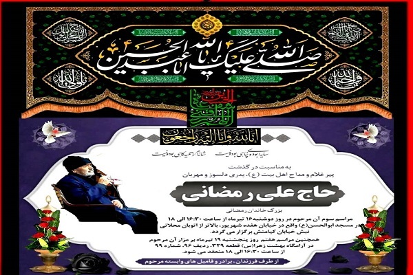 به گزارش ایکنا، مراسم سومین روز درگذشت مرحوم علی رمضانی، پیرغلام و مداح اهل بیت(ع) فردا دوشنبه 16 تیر ماه از ساعت 16:30 تا 18 در مسد ابوالحسن(ع) واقع در خیابان هفده شهریور، بالاتر از اتوبان محلاتی، نبش خیابان کیامنش برگزار میشود.